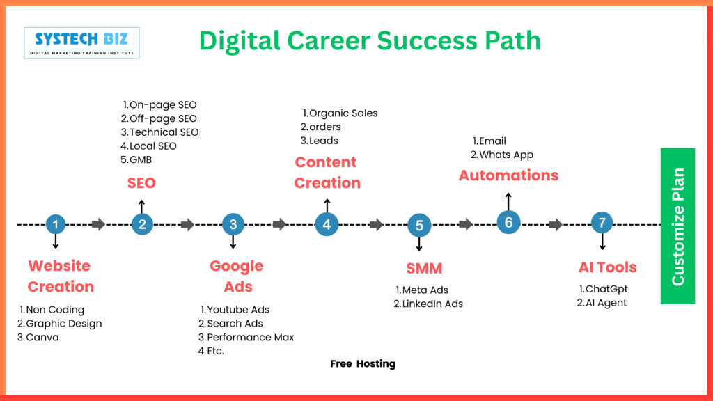 Our classroom and live project-based learning ensure you don’t just learn — you apply. Whether you’re aiming for a job, freelancing career, or business growth, SYSTECHBIZ is the digital marketing institute that supports your goal with hands-on tools, expert trainers, and placement guidance.